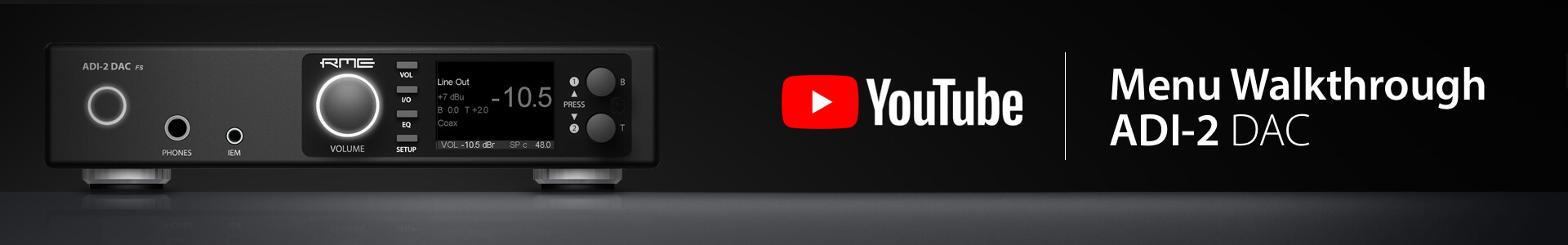 The updated ADI-2 DAC uses ESS's ES9028Q2M in a special circuit variant developed by RME engineers that allows the chip to perform at its best. With noise levels of 123 dBA, distortion less than -120 dB, or THD+N of -116 dB, the device delivers outstanding measured values, and allows the IEM output to reach a sensational low noise level of -121 dBu. In addition, there is +2.5 dB of digital headroom, so that high intersample peaks do not produce any audible distortion. The reserve in volume setting results in a still undistorted analog output signal even at a volume setting of +2.5 dB.