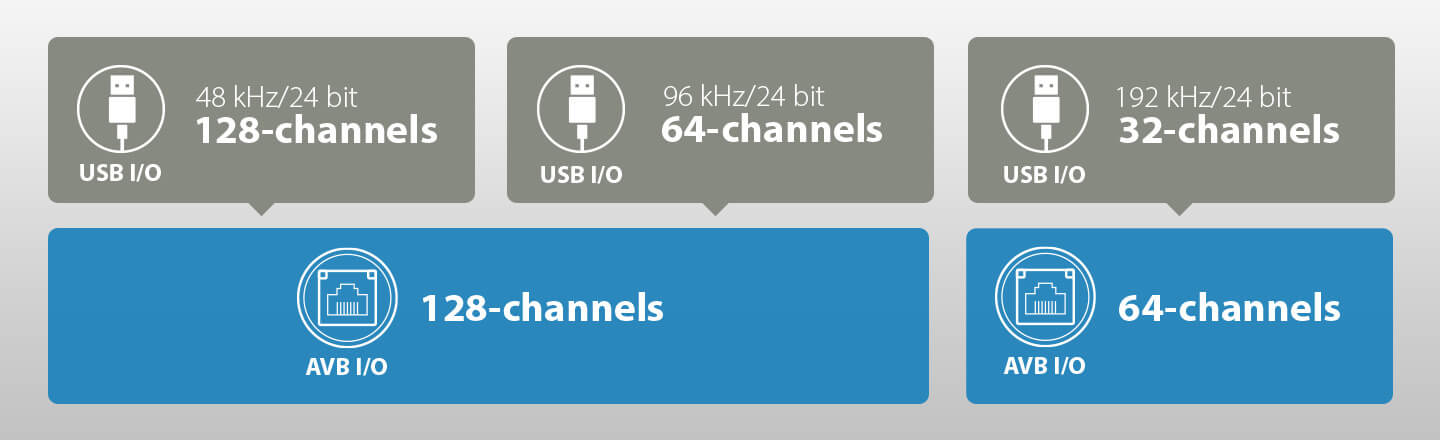 RME’s Digiface AVB showcases how audio can be transferred from a Mac or PC into the network and back using the AVB protocol stack. It allows to send up to 128 audio channels for record and playback at 48 kHz / 24 bit sampling frequency and 64 channels at 96 kHz (128 channels I/O AVB) or 32 channels at 192 kHz with quad speed (64 channels I/O AVB).