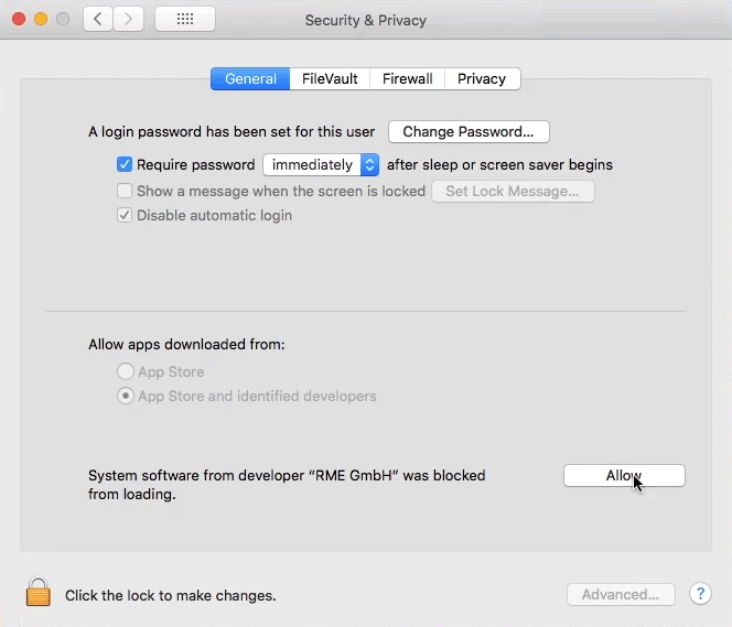 The RME applications will have to be authorized manually in System Preferences / 'Security and Privacy'. No longer than 30 minutes after installing the RME driver, you will need to click the 'Allow' button in the lower right corner.