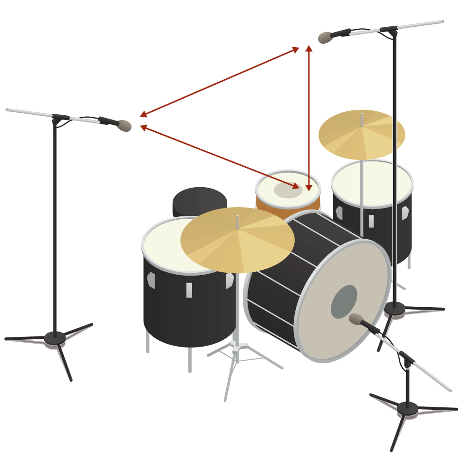 This three mic technique uses two overhead mics and third mic on the bass drum. Glyn Johns invented it back in the 60s and can be heard on many popular albums by The Rolling Stones, The Who or Led Zeppelin.