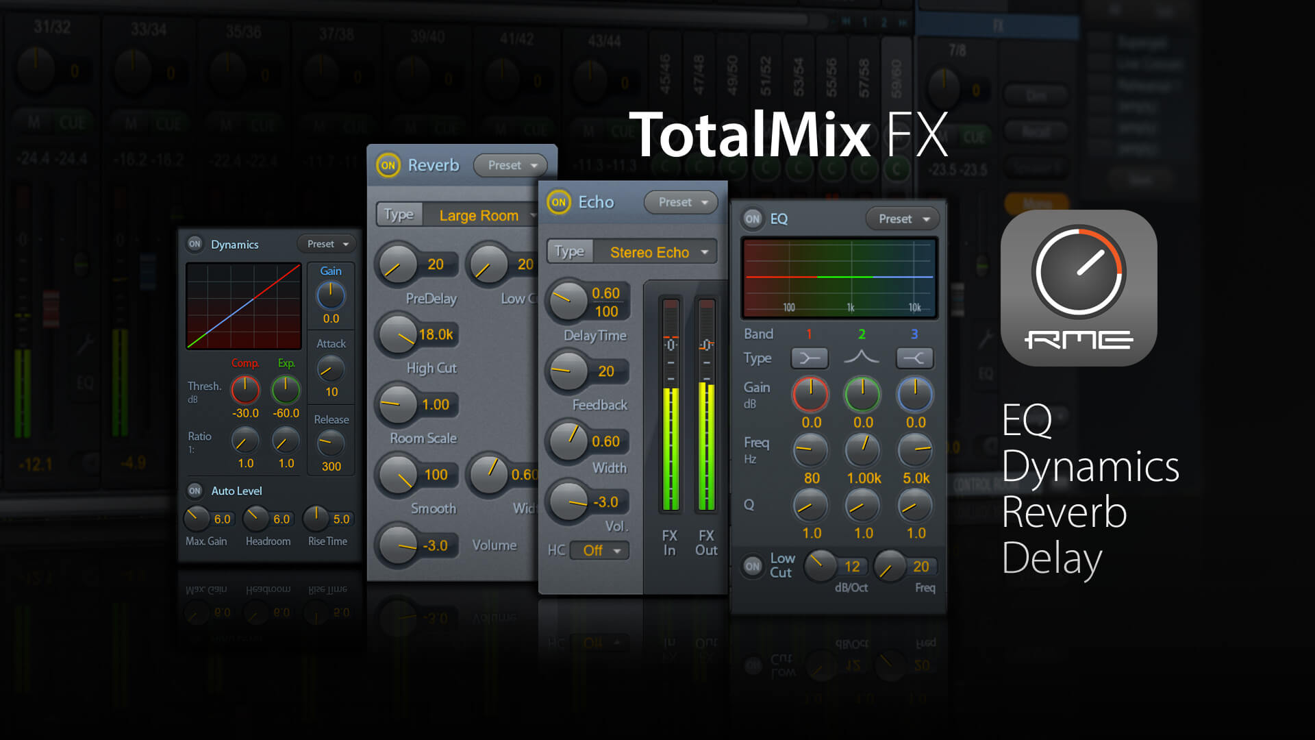 With supported hardware, TotalMix FX includes a complete effects system, which not only adds flexibility to the recording chain, but also makes latency saddled software solutions obsolete. TotalMix FX (FX on supported cards) can completely replace an external mixer, enabling the creation of multiple latency-free monitor mixes with EQ, Dynamics, Reverb and Delay for any outputs incl. main monitors and headphone mixes for musicians.